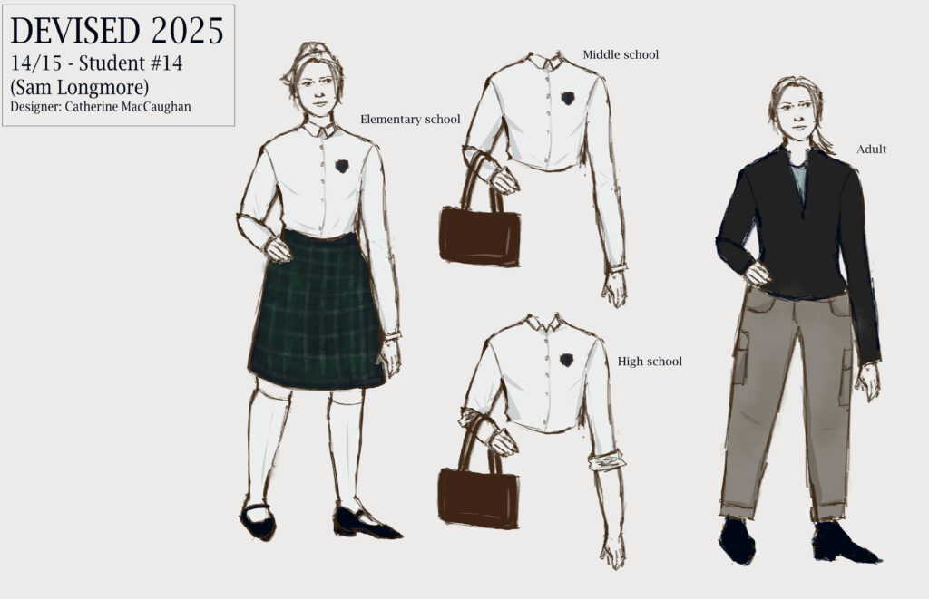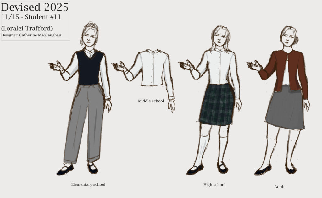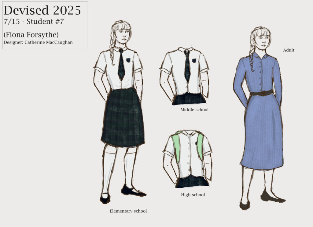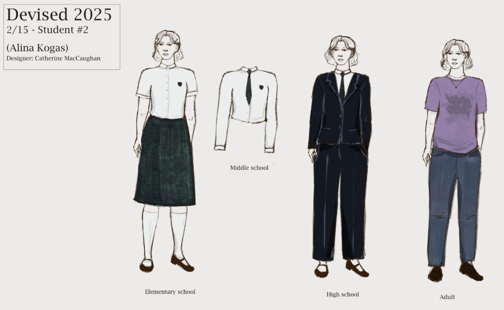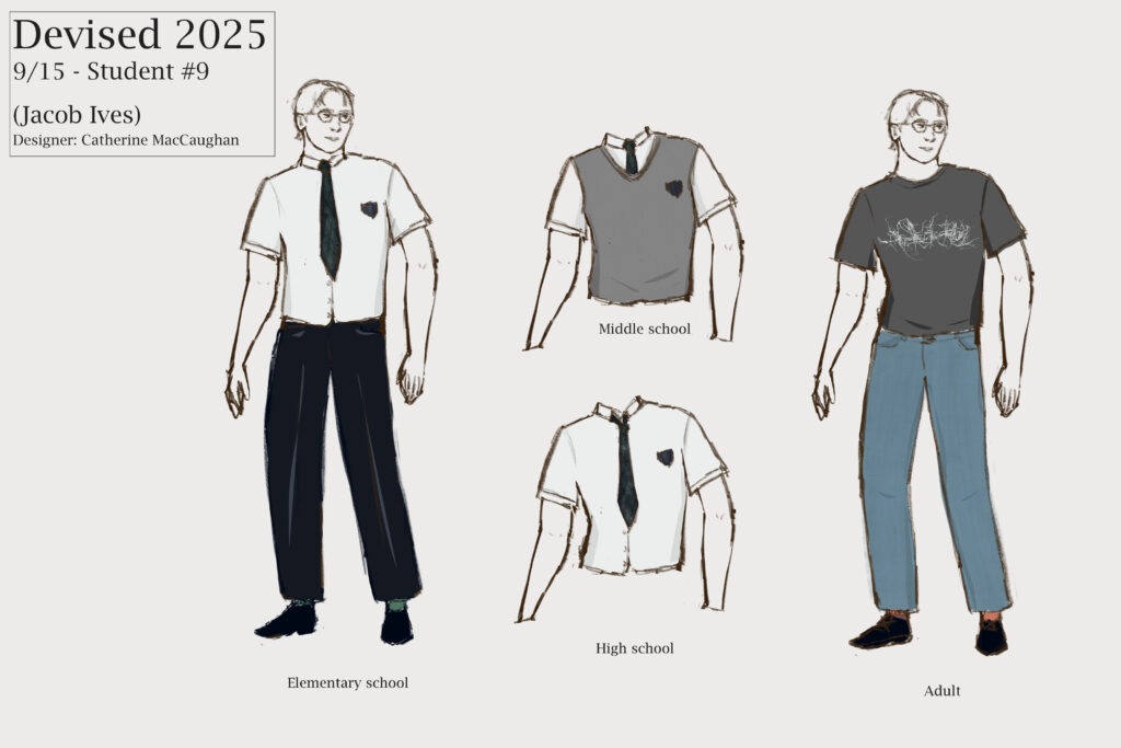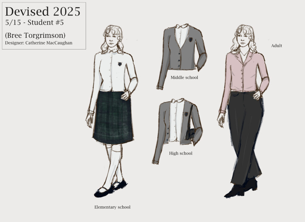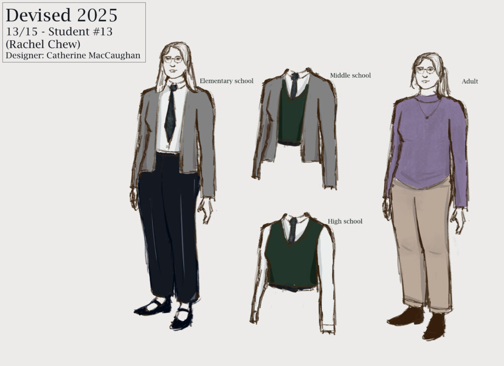 Learning Curve, follows a fictional group of private school students from elementary school to high school. The costumes were designed to show the passage of time through four different eras: elementary school, middle school, high school, and a ten year reunion as adults. They also explore the student’s search for identity within the constraints of a school uniform.