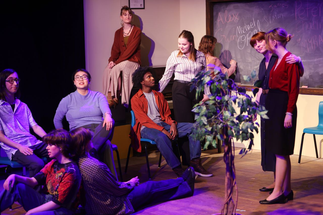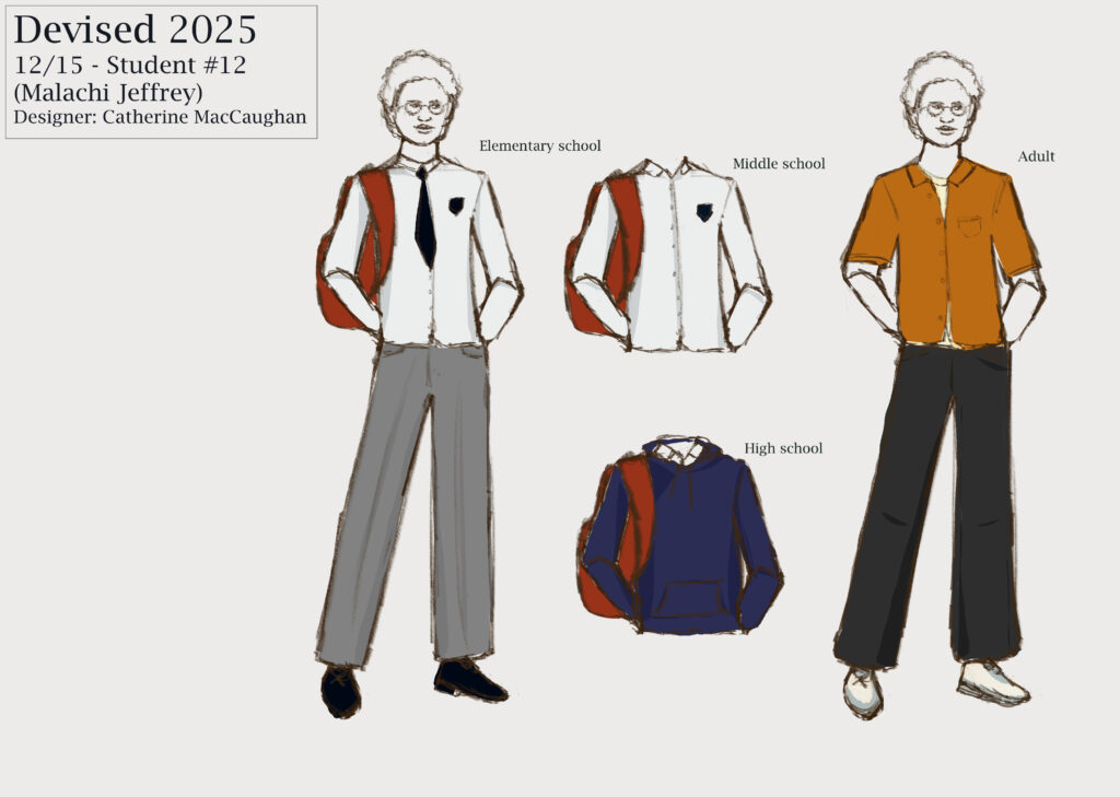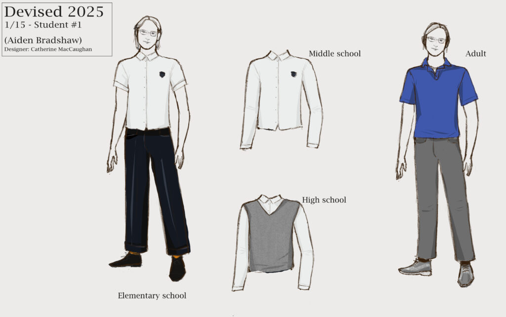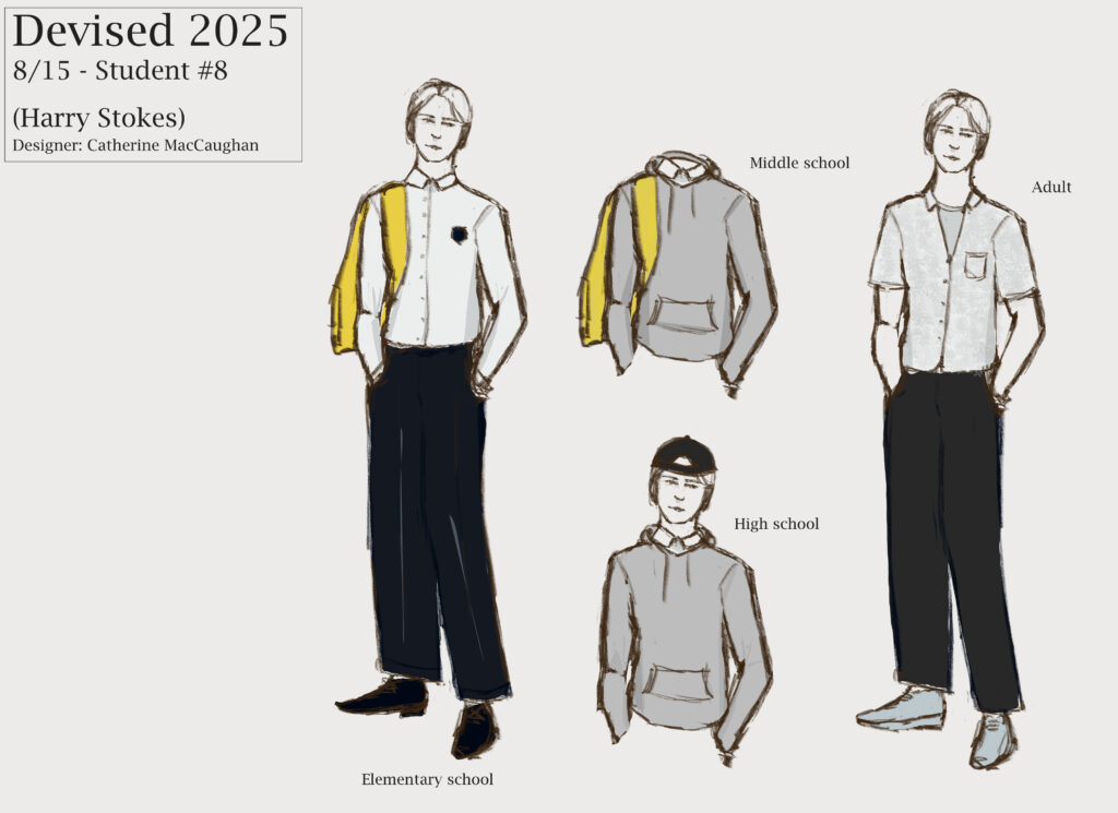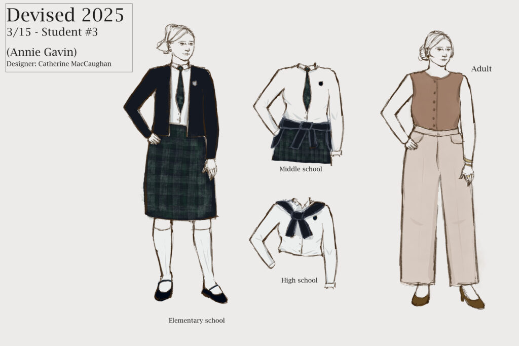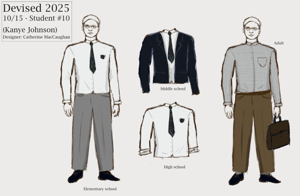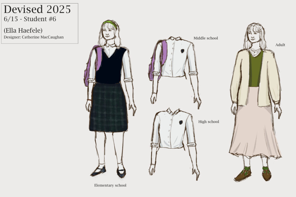 Learning Curve, follows a fictional group of private school students from elementary school to high school. The costumes were designed to show the passage of time through four different eras: elementary school, middle school, high school, and a ten year reunion as adults. They also explore the student’s search for identity within the constraints of a school uniform.